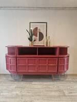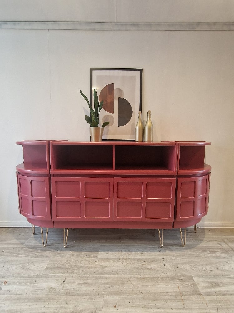 Elevate your space with this luxurious Mid Century Nathan sideboard, beautifully refinished in Eating Room Red by Farrow & Ball finish and complemented with elegant gold hairpin legs.