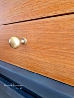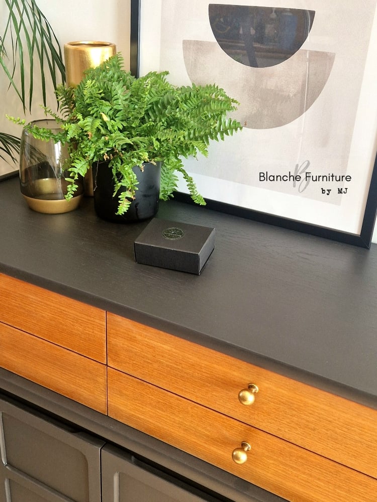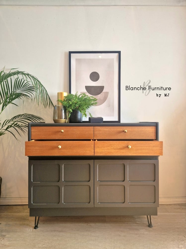 This gorgeous sideboard has been raised onto black hairpin legs, with gold handles.