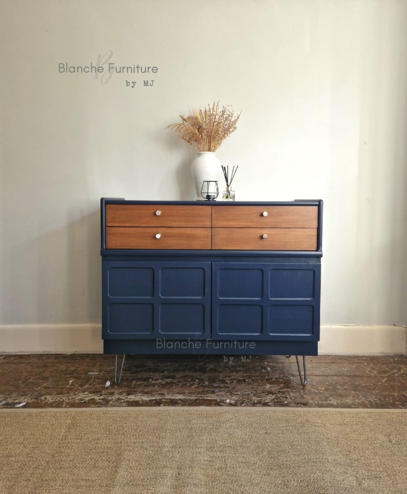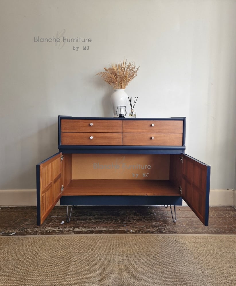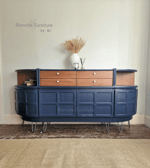 Elevate your space with this luxurious Mid Century Nathan sideboard, beautifully refinished in a Midnight Blue finish and complemented by Walnut drawers and cubby areas along with elegant gold hairpin legs and matching handles.