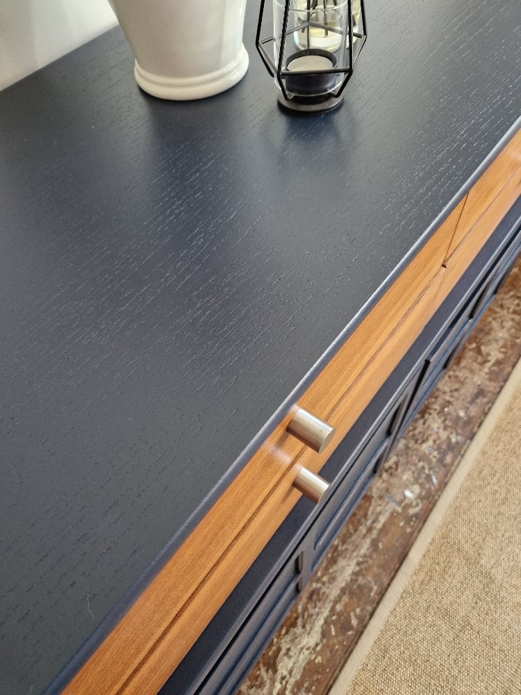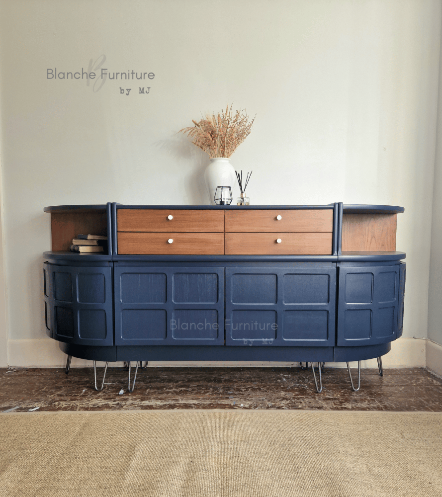 Large Mid Century Luxury Sideboard Nathan | Curved Teak Sideboard Blue | 4 Walnut Drawers
