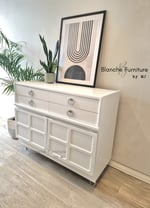 Elevate your space with this luxurious Mid Century Nathan sideboard, beautifully refinished in a White with elegant steel hairpin legs and matching handles.