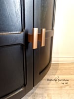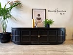 This sideboard consists of a single two door sideboard, placed in between 2 curved corner units. Each unit has been professionally hand painted in a Matt Black and sealed with layers of varnish for protection against every day usage.
