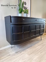 Elevate your space with this luxurious Mid Century Nathan sideboard, beautifully refinished in a crisp black finish and complemented by elegant steel hairpin legs and matching handles.