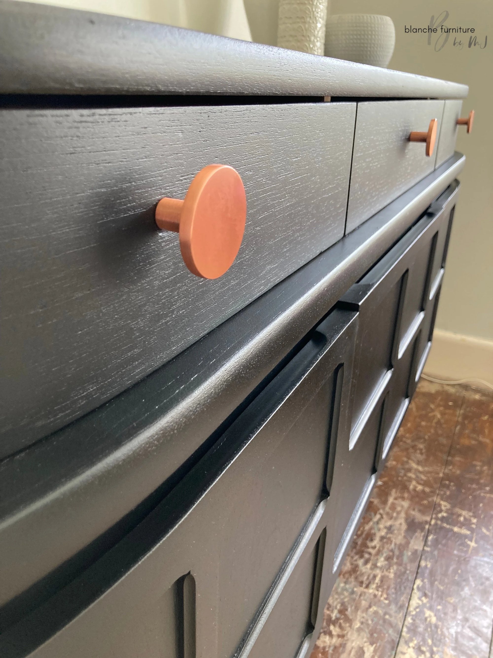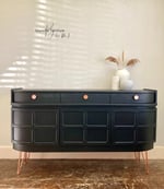 Elevate your space with this luxurious Mid Century Nathan sideboard, beautifully refinished in a crisp black finish and complemented by elegant copper hairpin legs and matching handles.