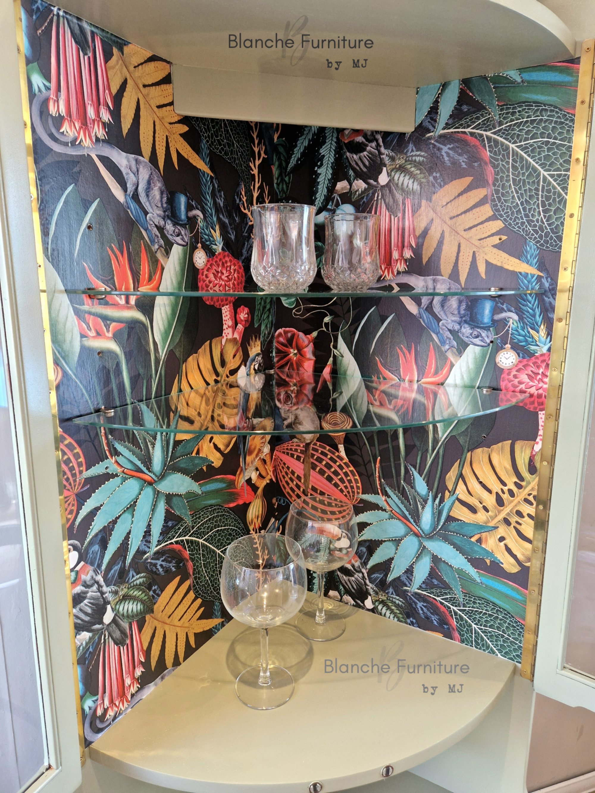 Tall, Mid Century, Curved Corner Drinks Cabinet unit with light with botanical lining.