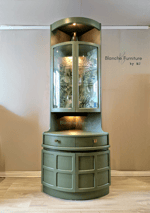 This cabinet has been professionally hand painted in a gorgeous olive green with a striking botanical patterned lining. It has been sealed with layers of varnish for protection against every day usage.