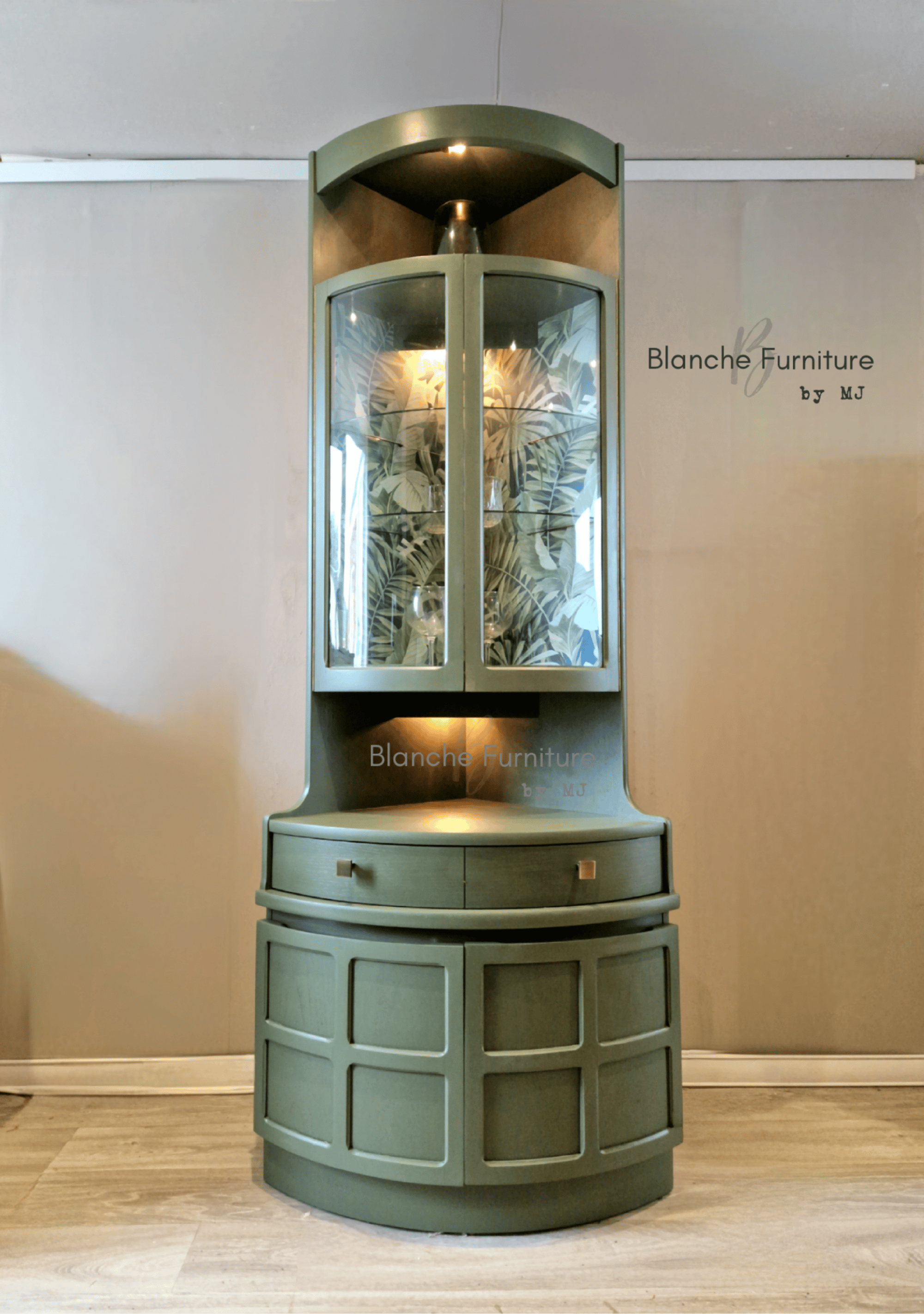 Tall, Mid Century, Curved Corner Drinks Cabinet in Olive Green with Botanical Lining