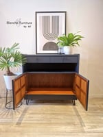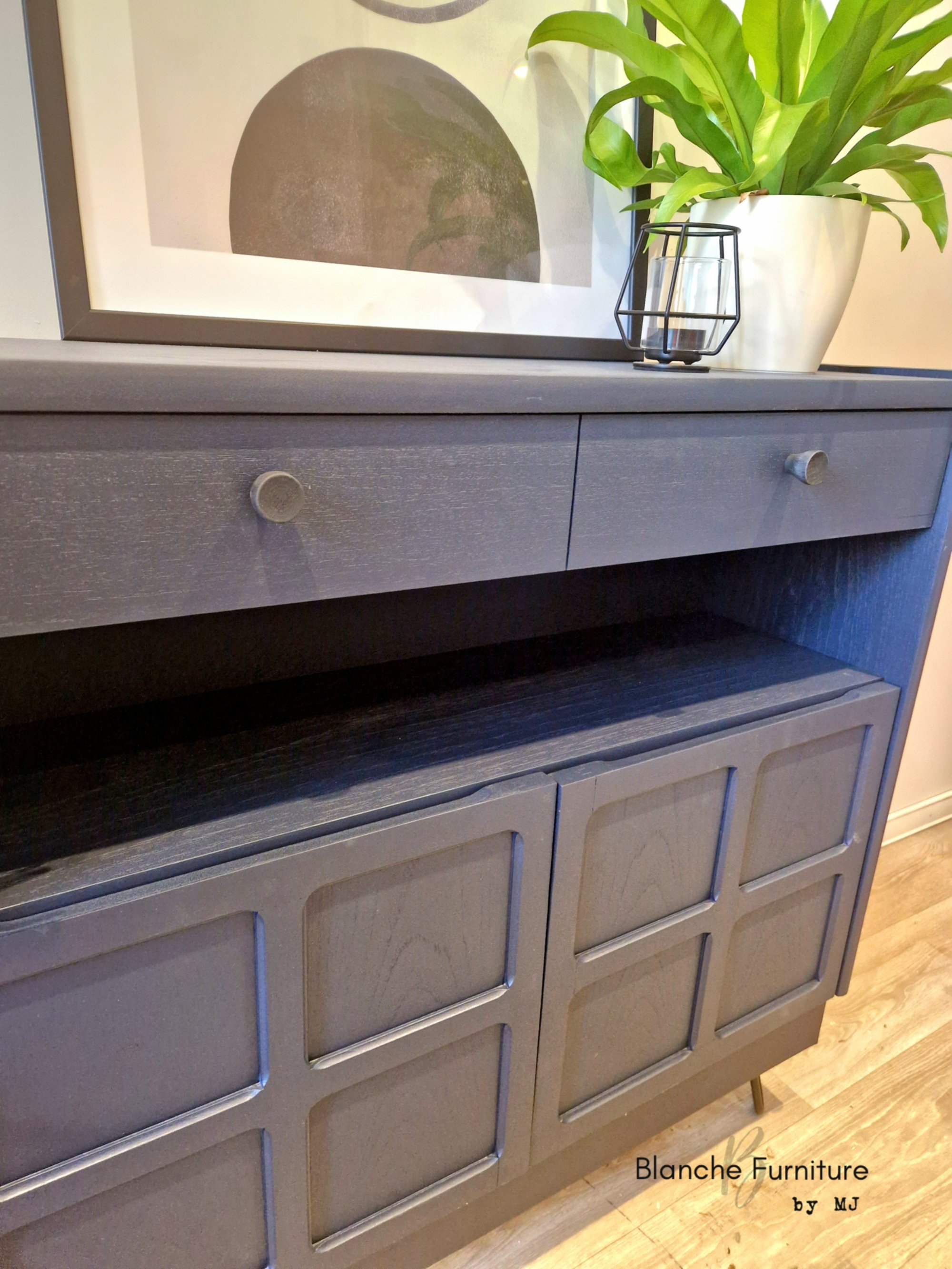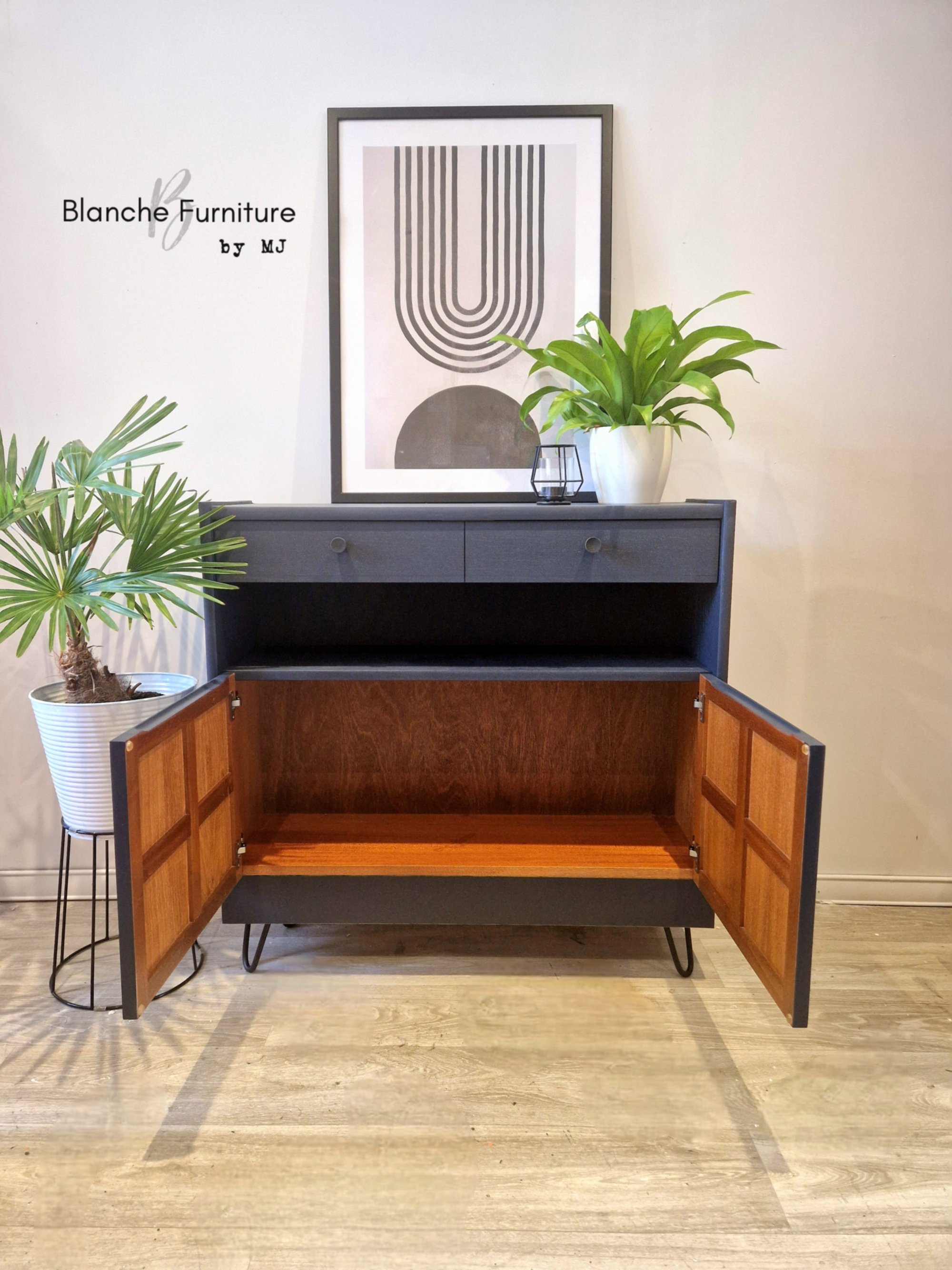 This piece has been professionally finished in a rich midnight blue and sealed to offer enhanced protection against every day use. It has been raised by black hairpin legs and black round knobs to offer contrast.