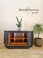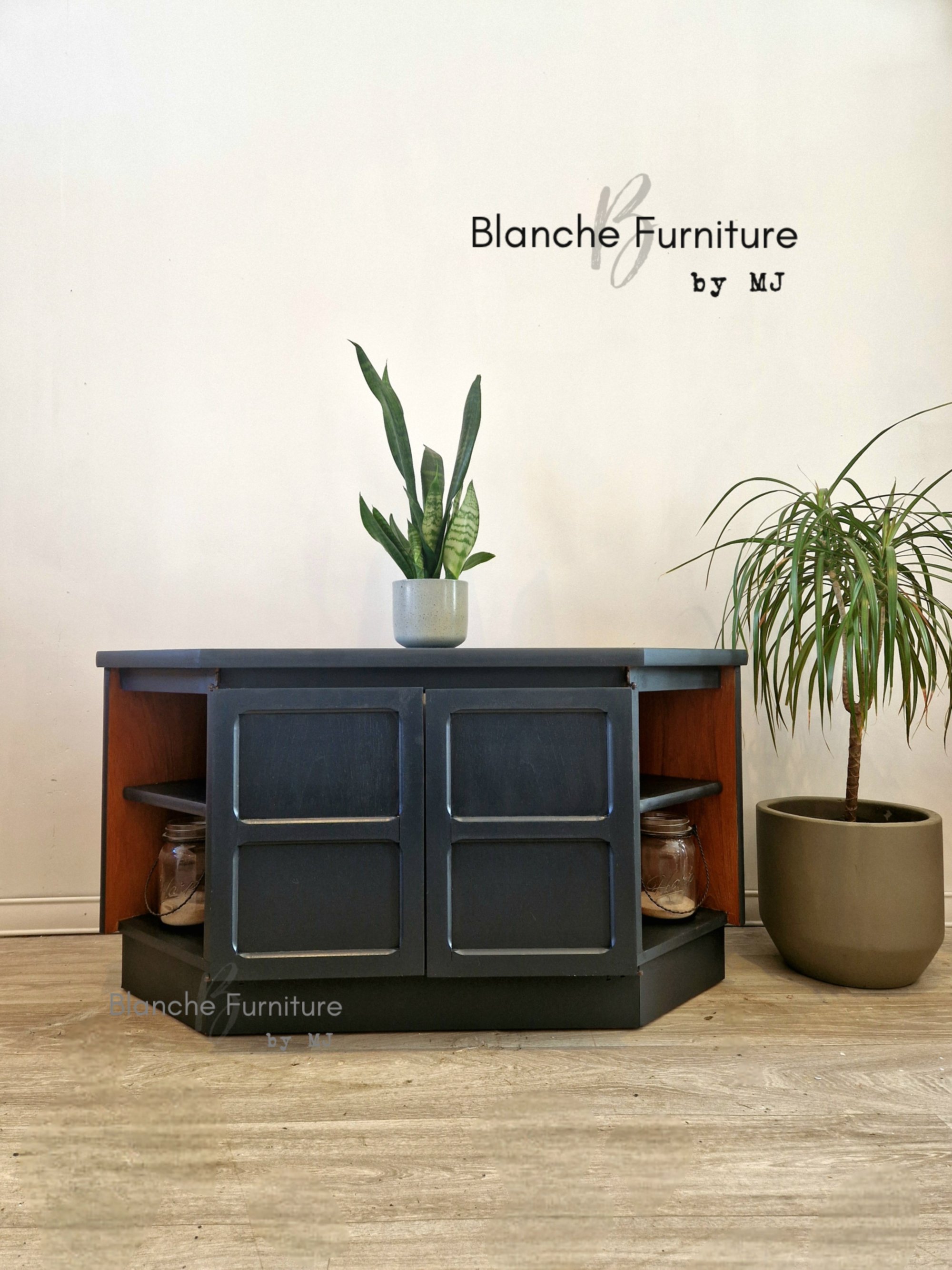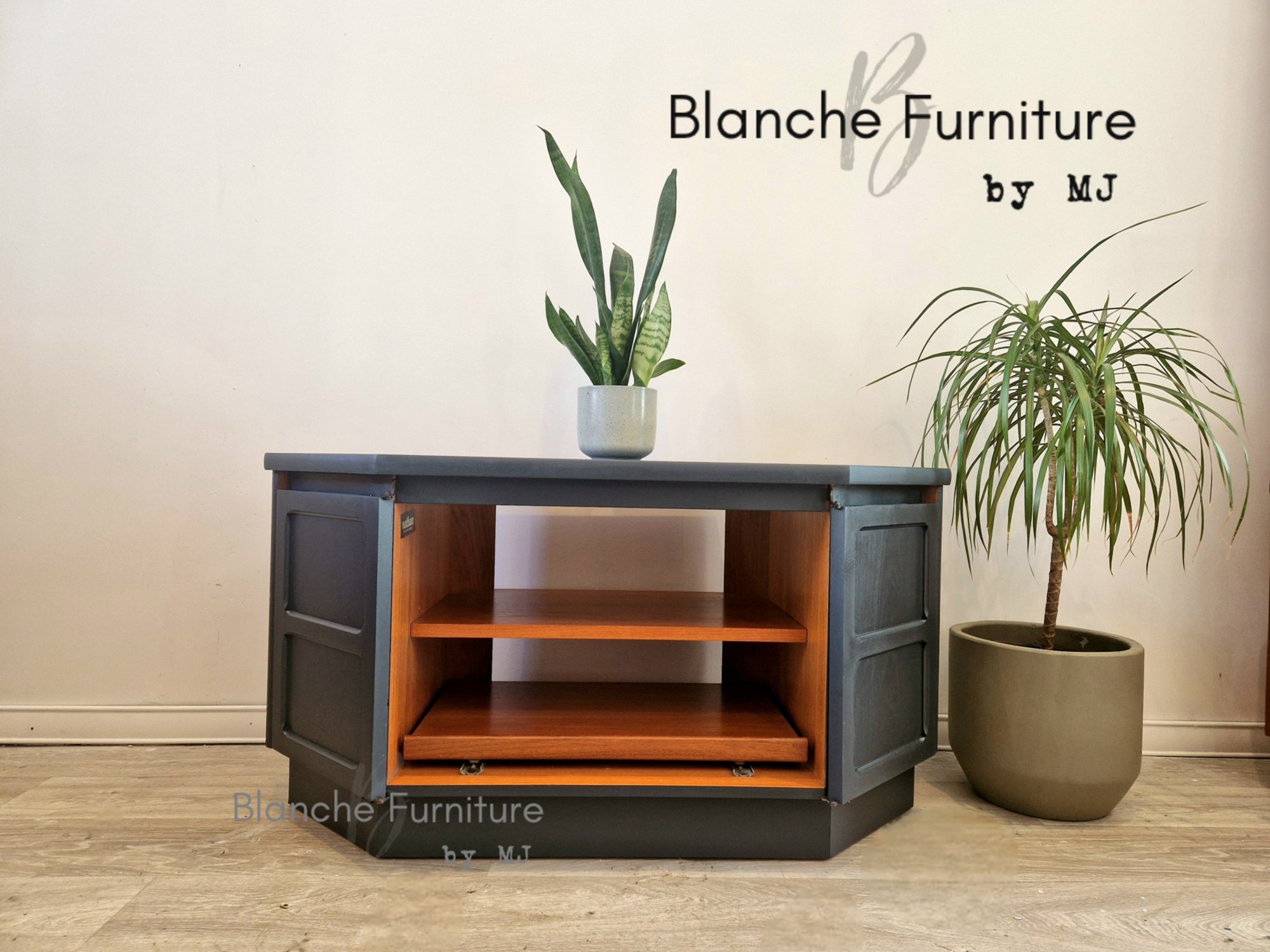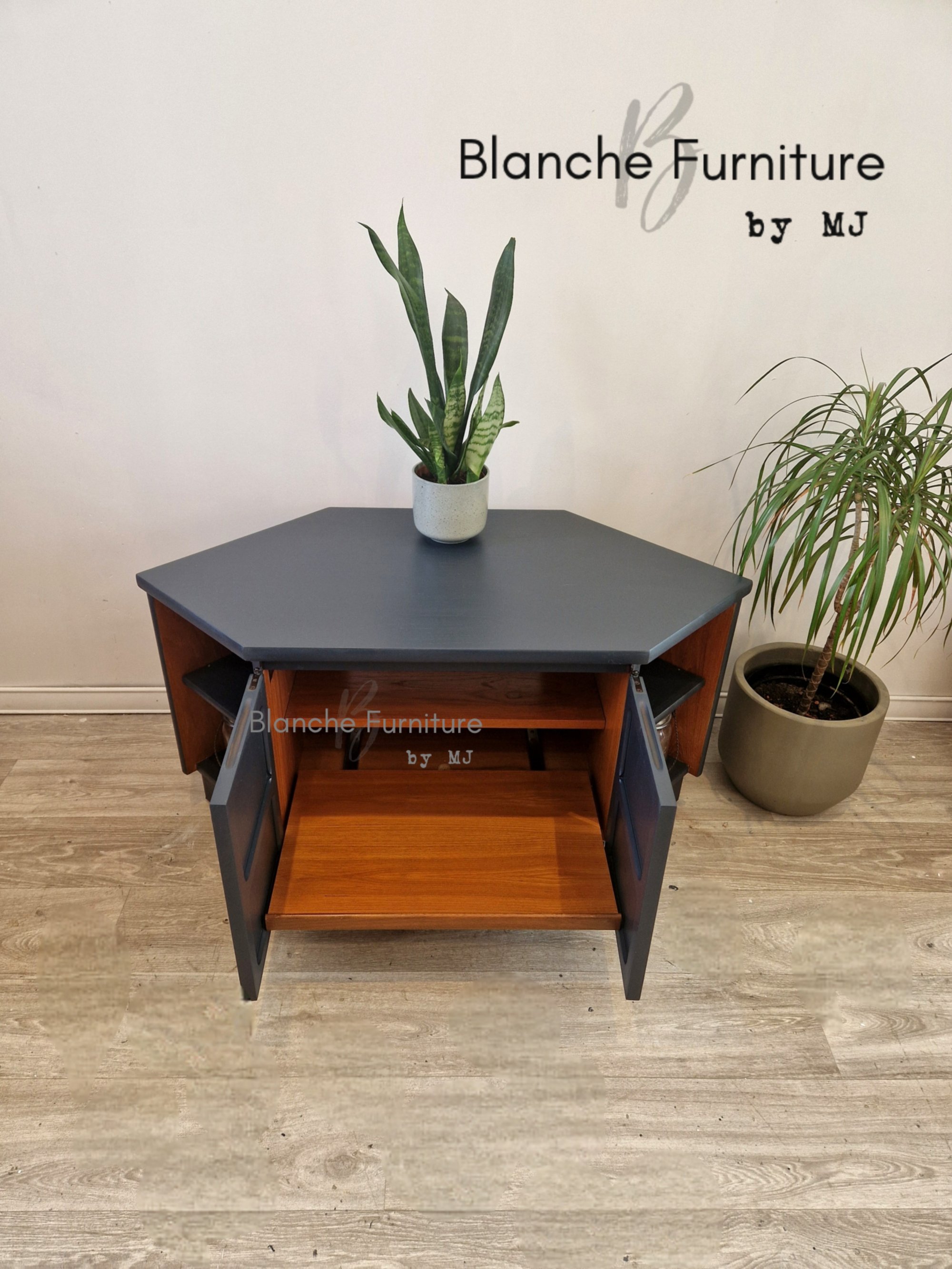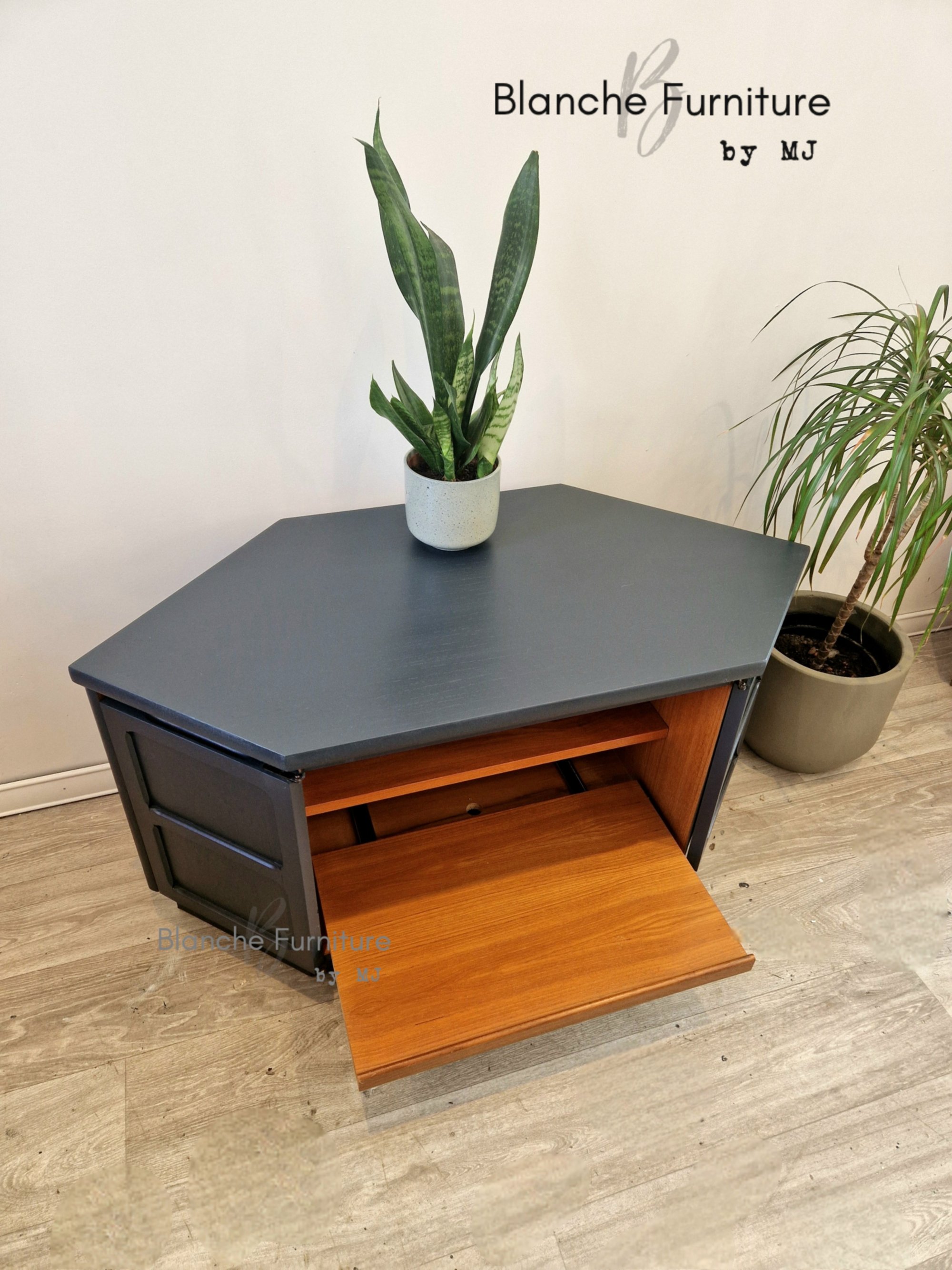 A stunning example of Nathan quality furniture, this Mid Century Modern corner media abinet will undoubtedly serve as a feature piece in any room.
